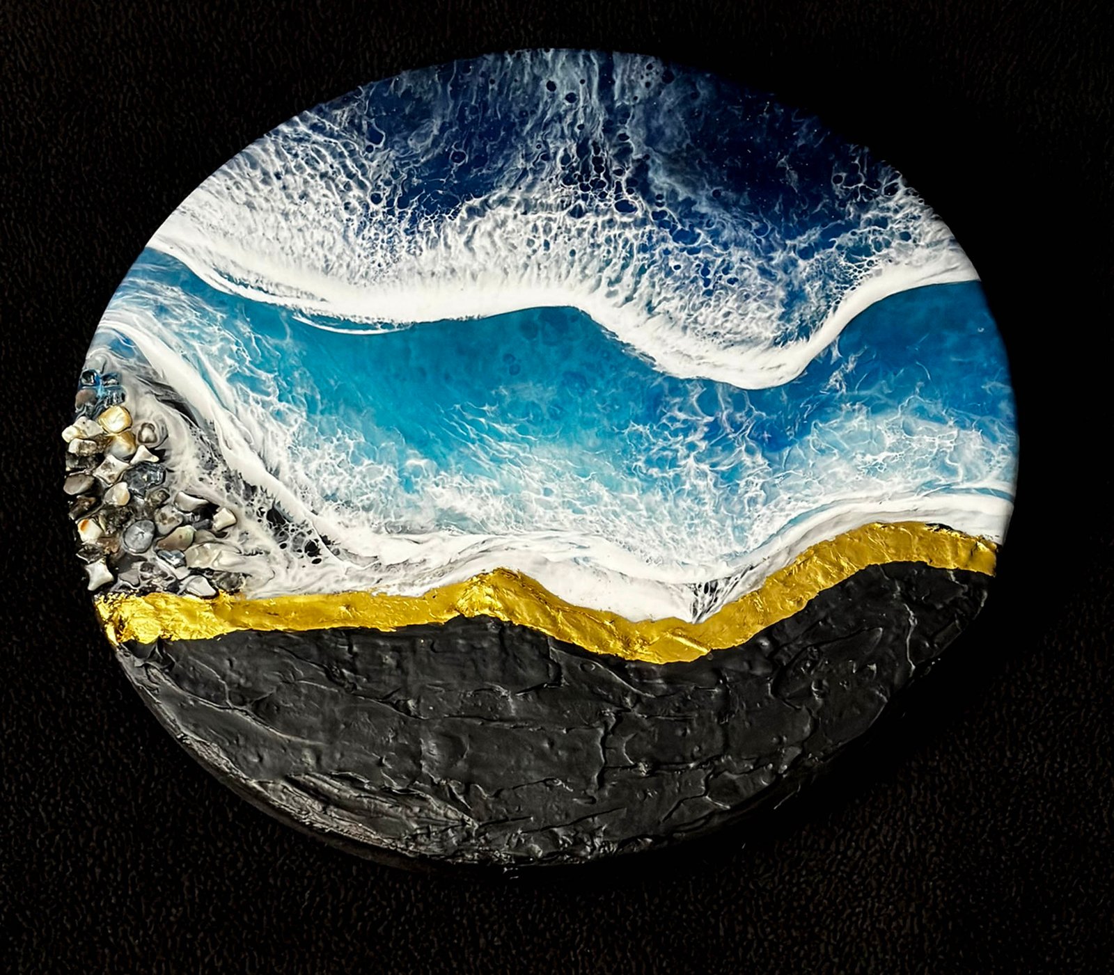 Mixed Media Wall Art Includes Acrylic Paint, Epoxy Resin, Australian Pigment Paste, Texture Past , Ash, Abalone Shells, Crystals, Varnish , Gold Leaf and Sealer.